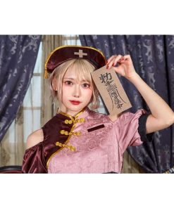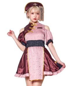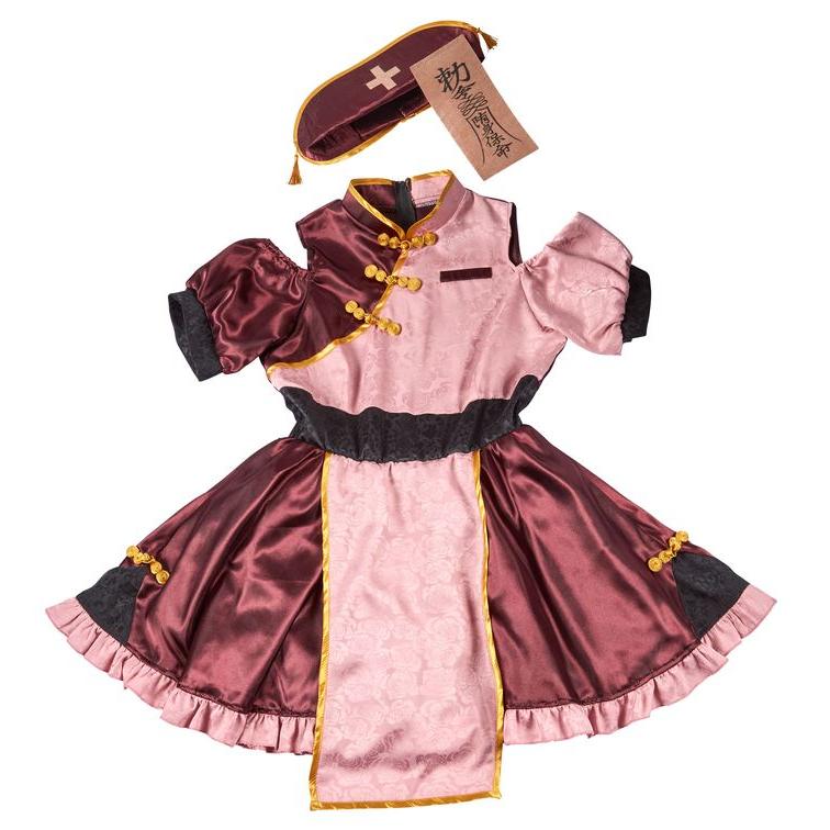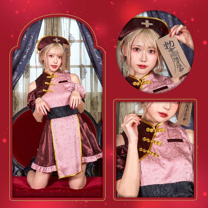 くすみピンク×ボルドーカラーの個性的でレトロガーリーなキョンシー。パイピングも色味を抑えたゴールドカラー。つや感のあるくすみカラーは肌馴染みも良く実は着こなし易い。スカートは内側のハードチュールを手で広げるとふんわりします。肩部分が開いていて程よく色っぽく。メイクもピンクボルドー系でまとめると可愛さUP。細かいデザインに拘ったコスチュームです。