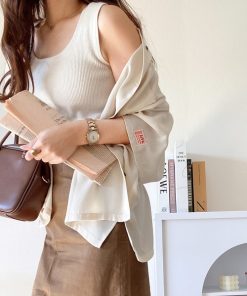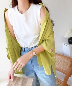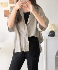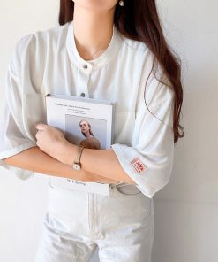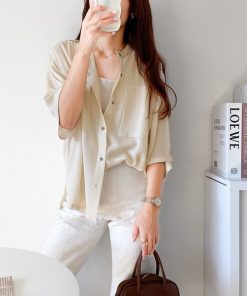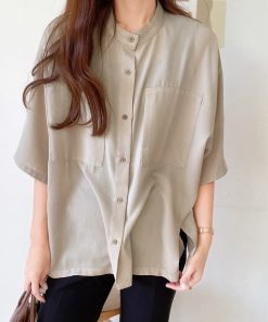 キーワード:ブラウス シャツ レディース ノーカラー ロング丈 七分袖 五分袖 無地 夏 春