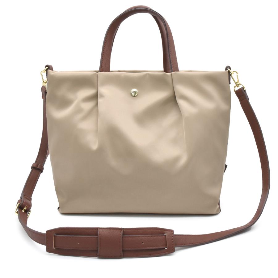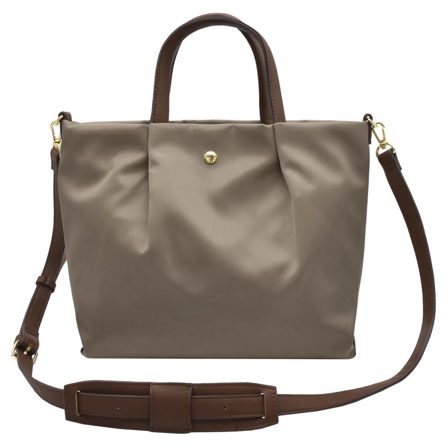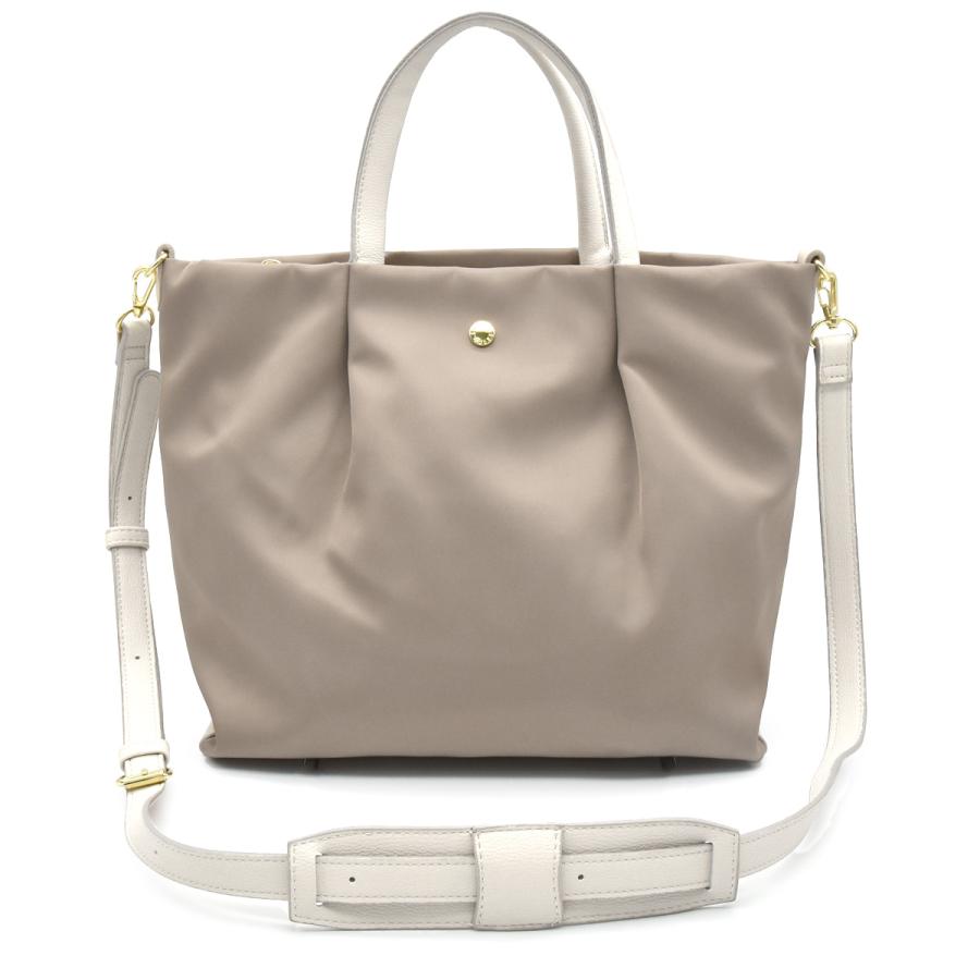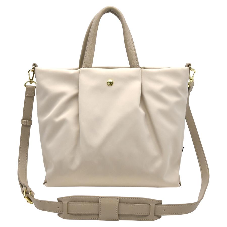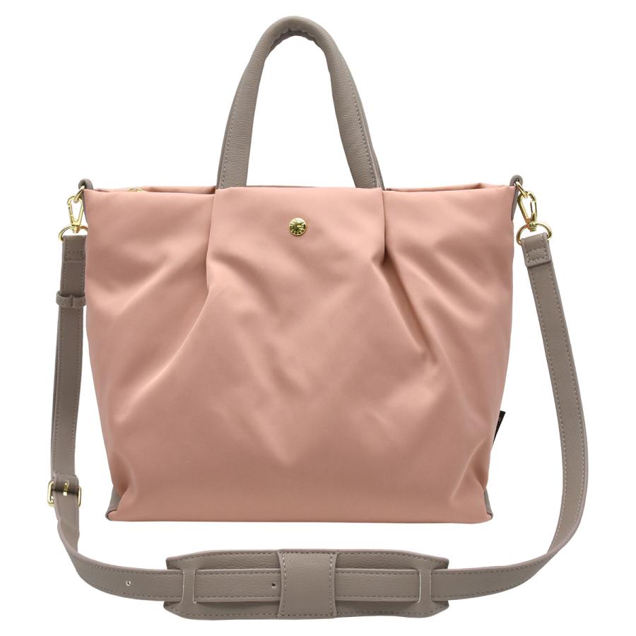 ハンドルやショルダーにこだわった人気の”肩楽シリーズ”に、新型が登場!クッション性のあるハンドルや、柔らかい合皮を使用したショルダーは、肩や腕への負担を軽くしてくれます。ショルダーパットは取り外し可能なので、シーンに応じて使い分けられるのもうれしいポイント。撥水加工が施されており、トートとショルダーの2WAY仕様なので、お出掛けから普段使いまで幅広く使える万能なバッグです。 A5サイズや長財布、ポーチや500mlペットボトルも入ります。おでかけはもちろん通勤用にもおすすめ!