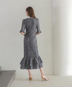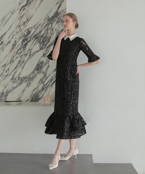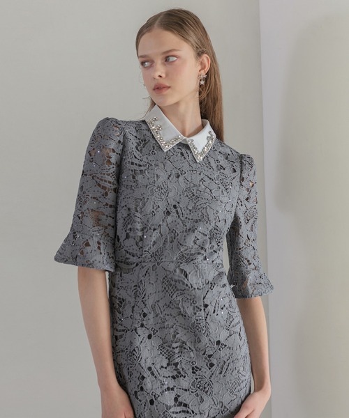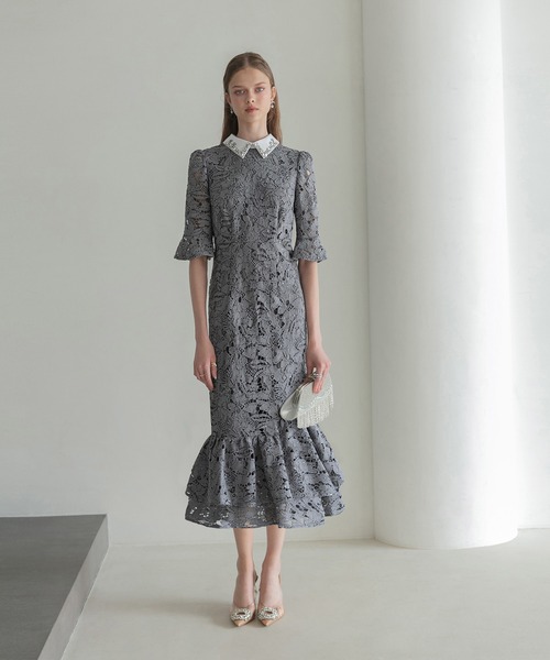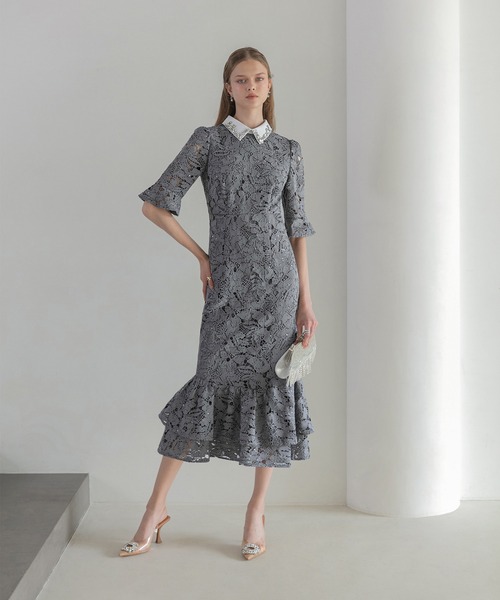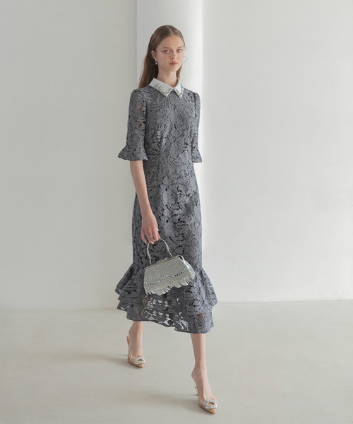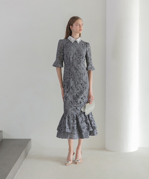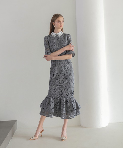 キーワード:ドレス ビジュー フリル フレア レース ロング ワンポイント 花柄 刺繍 半袖 無地 キレイめ パーティー フェミニン 結婚式 結婚式二次会 大人カジュアル