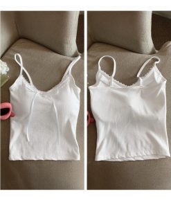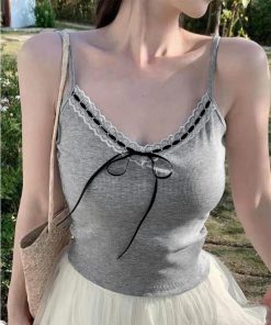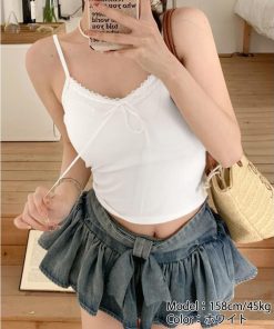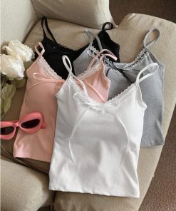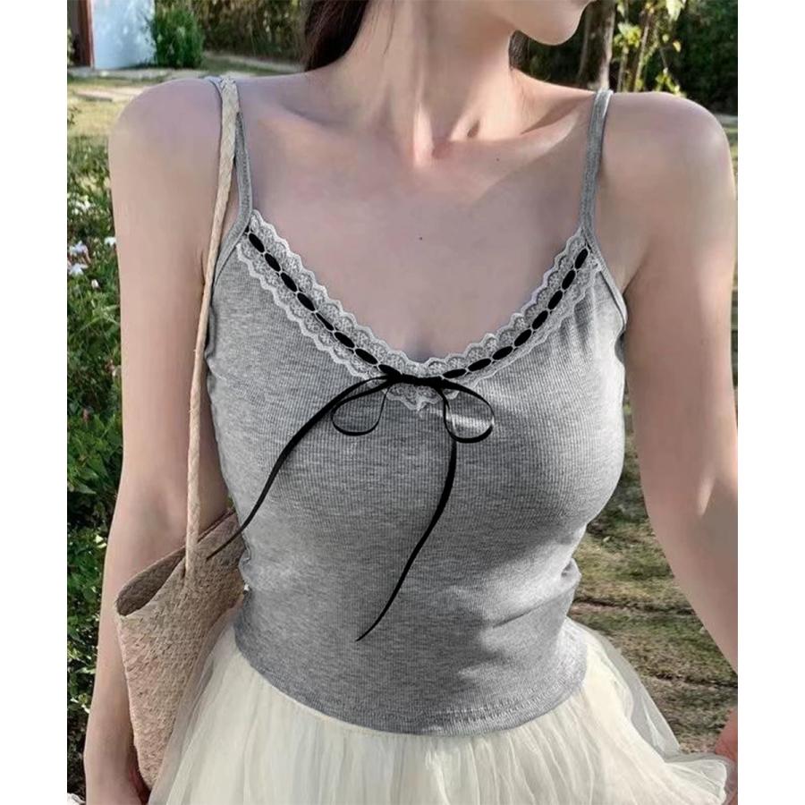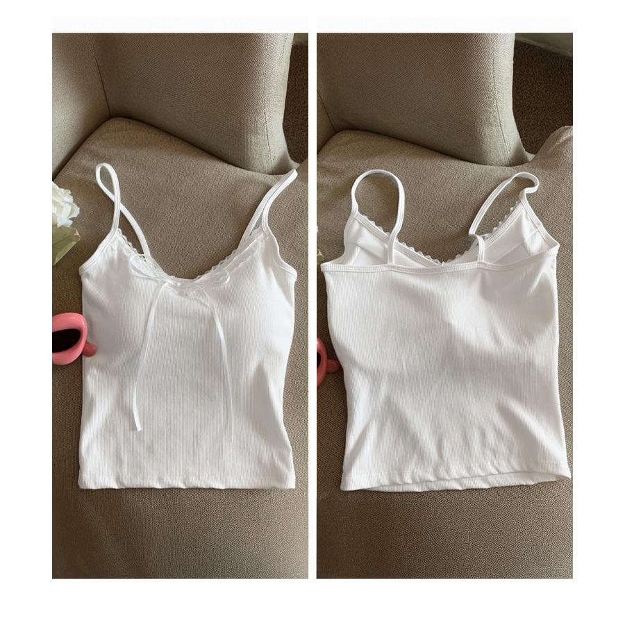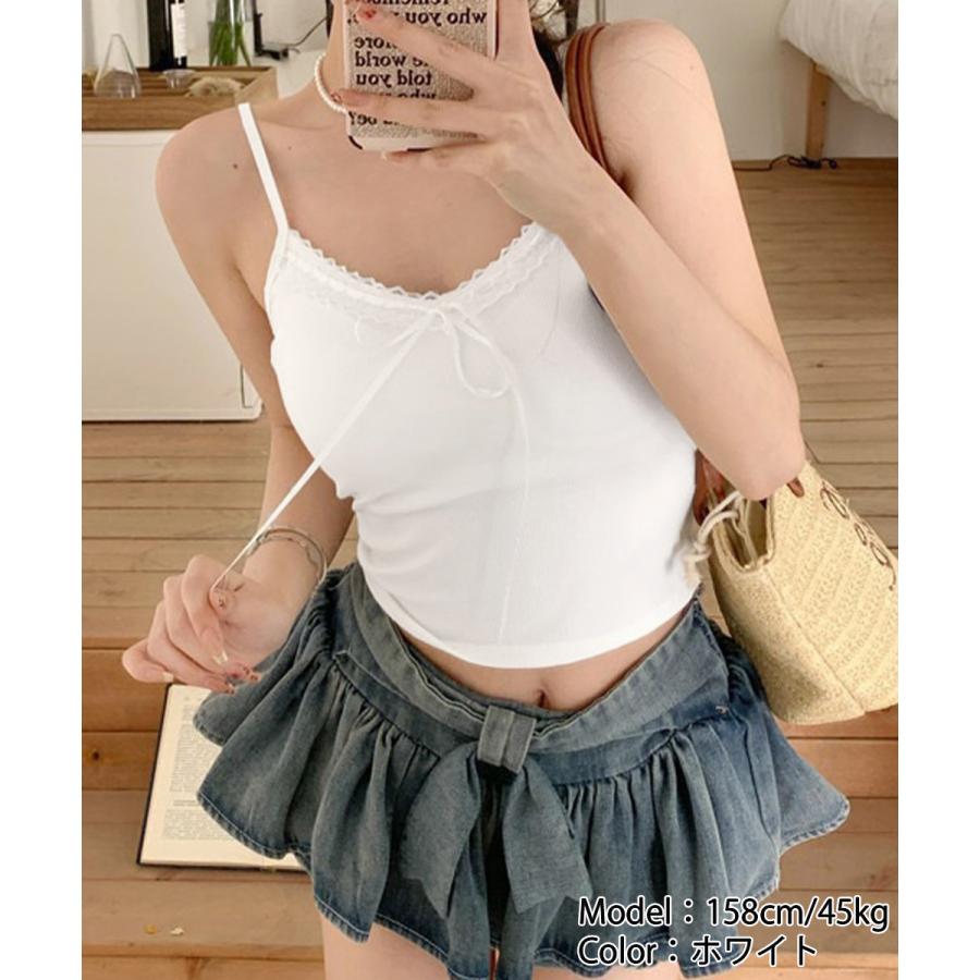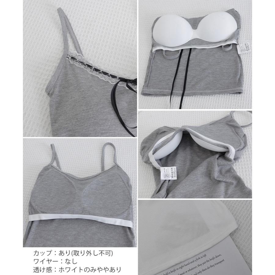 レースとリボンのディテールが可愛らしい、カップ付きリブ編みキャミソール。
