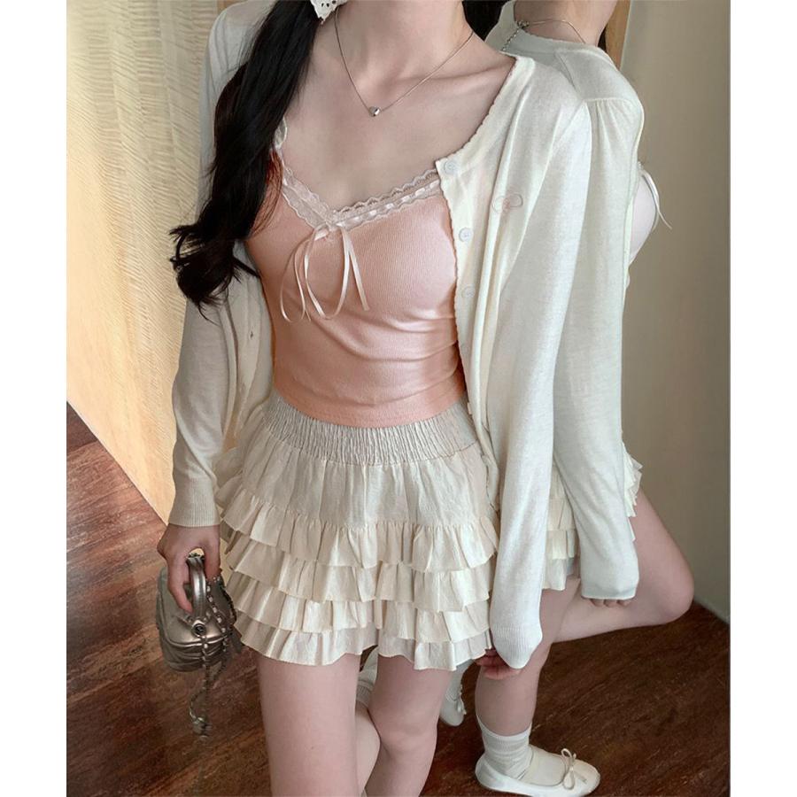 カーディガンやシアーシャツを羽織って、フェミニンなレイヤードスタイルに。