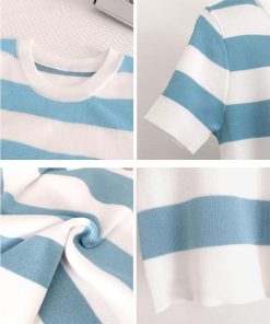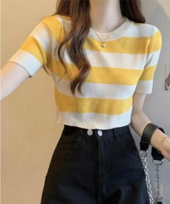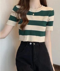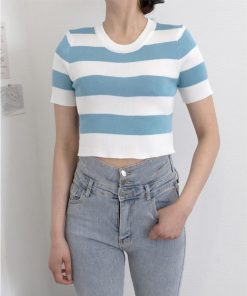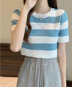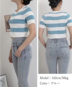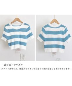 ショート丈ニットトップス へそ出し レディーストップス クルーネック ニットTシャツクロップド 配色ライン カジュアル