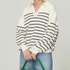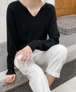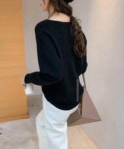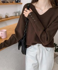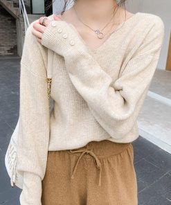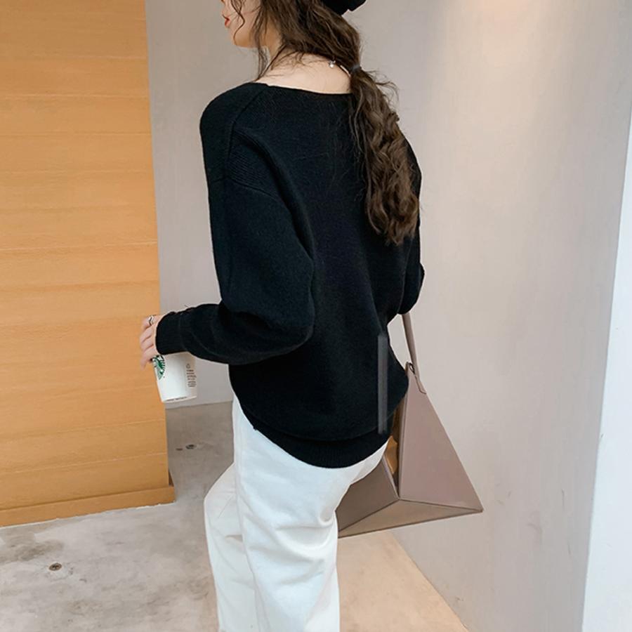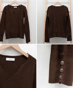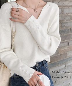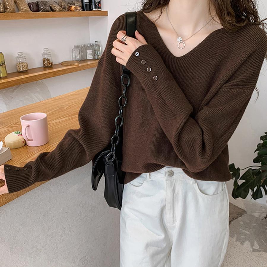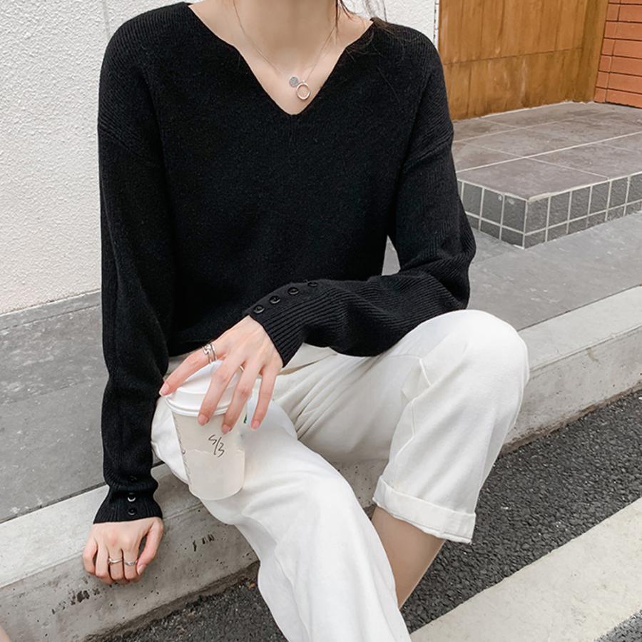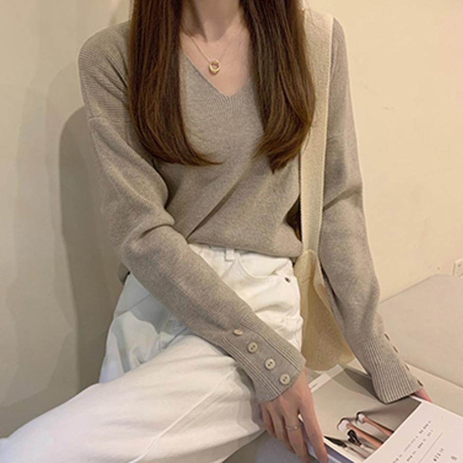 ネックラインスリットと袖にボタンをあしらった大人っぽい韓国風ニットトップス