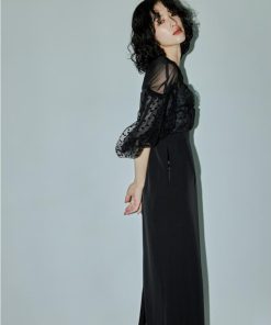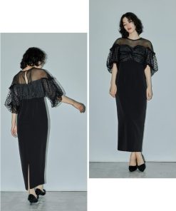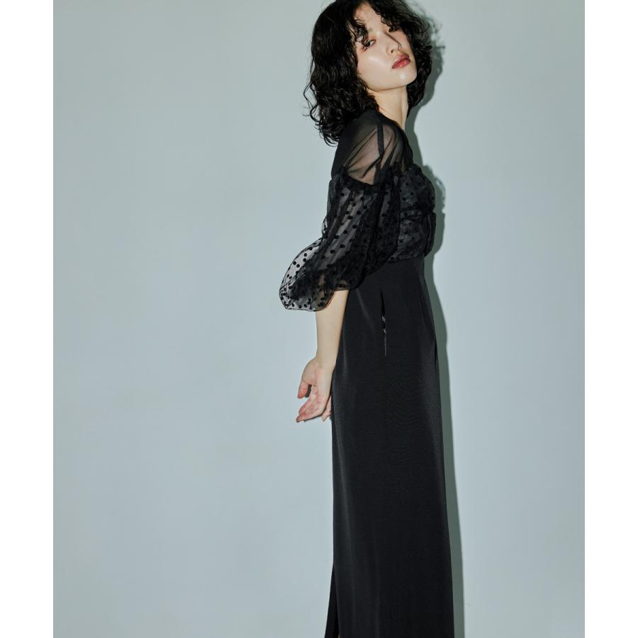 【商品名】フロッキードットワンピース パーティードレス 結婚式 チュール 水玉 ビスチェ Iライン タイト パフスリーブ 七分袖 可愛い お呼ばれ パーティー 二次会 披露宴