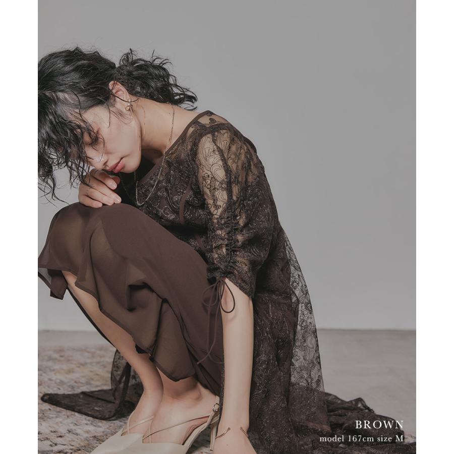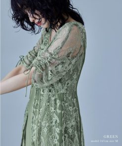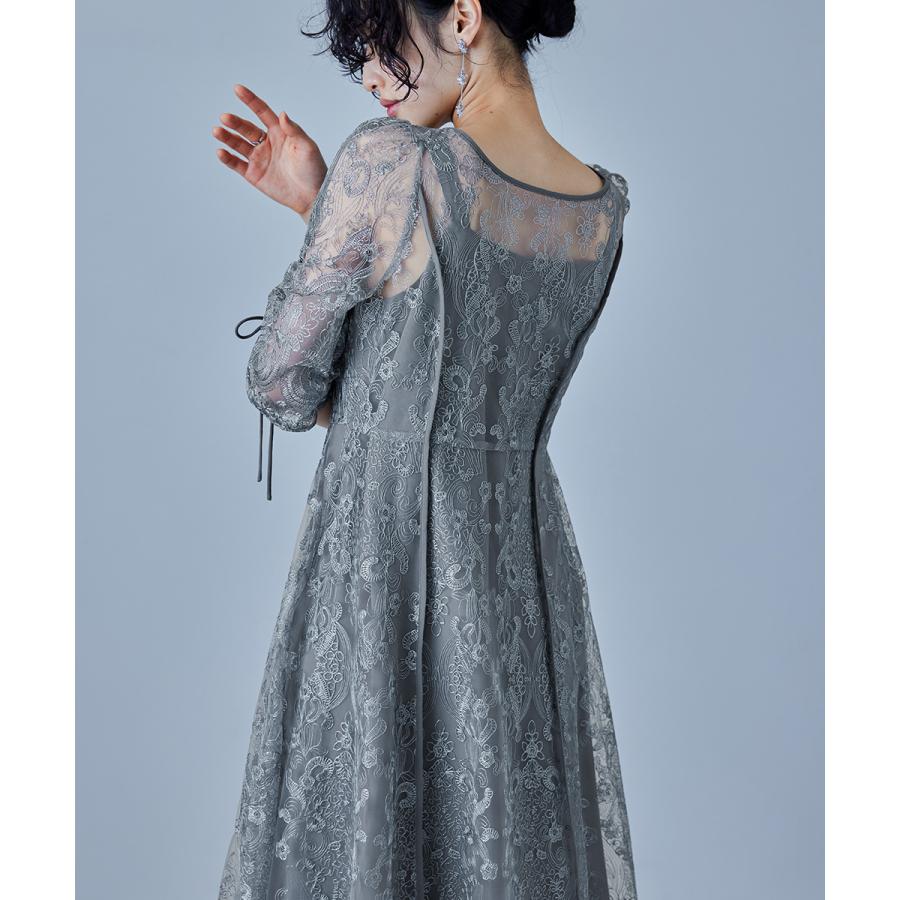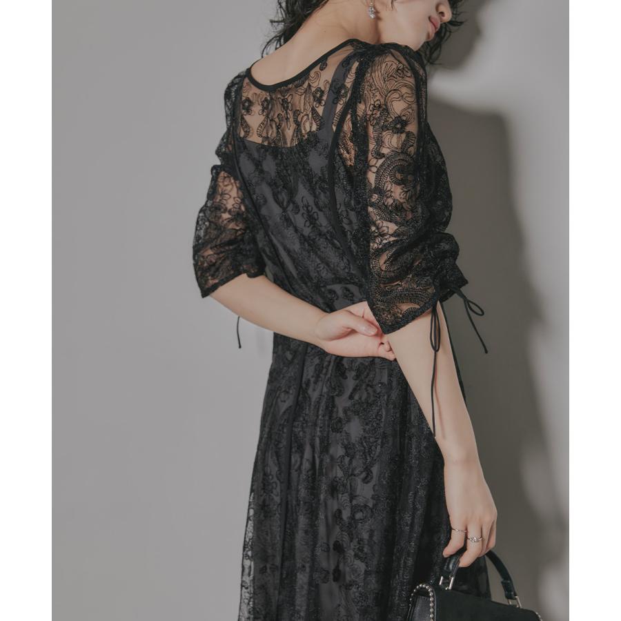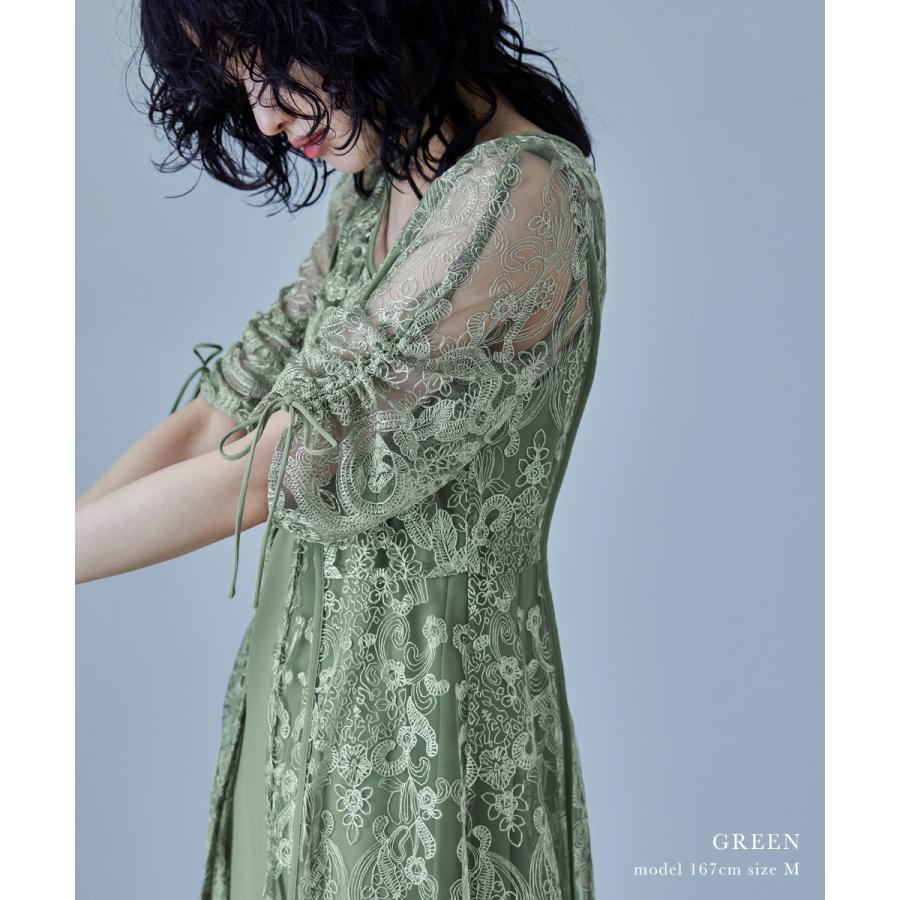 【商品名】刺繍レースロングカーデキャミワンピセットドレス 結婚式 ワンピース パーティードレス レイヤード カーディガン フレア ボリューム袖 リボン 袖あり 七分袖