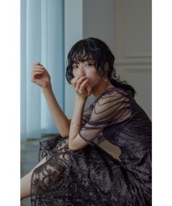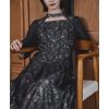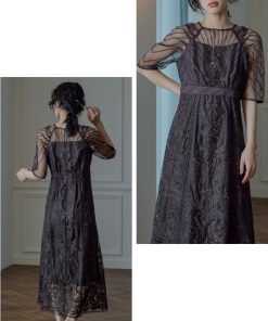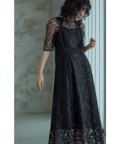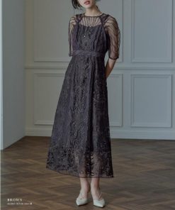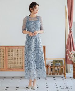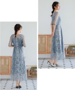 niana 結婚式 ワンピース パーティードレス レース 総レース 刺繍 ロング丈 ボリューム袖 袖あり 5分袖 半袖 スカート シアー 透け感 フレア ロングドレス