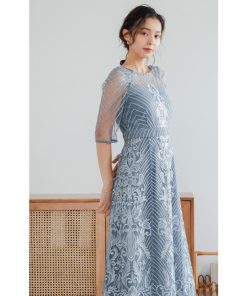 【商品名】結婚式 ワンピース パーティードレス レース 総レース 刺繍 ロング丈 ボリューム袖 袖あり 5分袖 半袖 スカート シアー 透け感 フレア ロングドレス