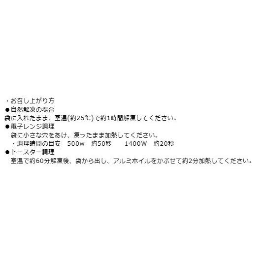 室温で約60分解凍後、袋から出し、アルミホイルをかぶせて約2分加熱してください。