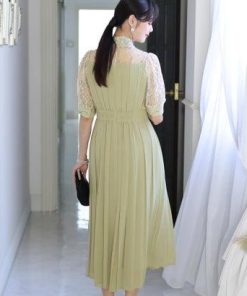 PourVous プールヴー ウエストリブパーティードレスお呼ばれロング&七分丈結婚式フォーマル ワンピース 20代 30代 40代 (マスタード)