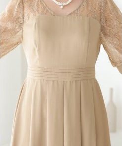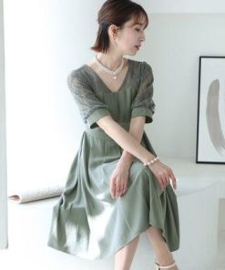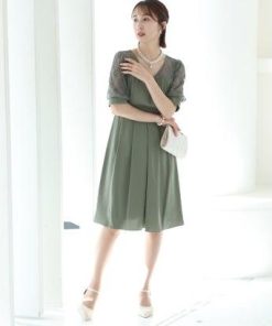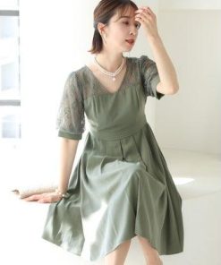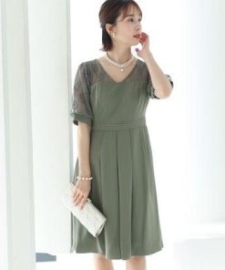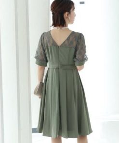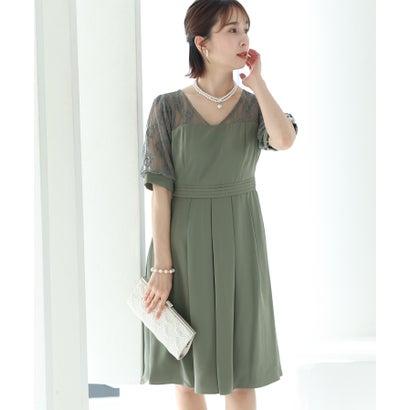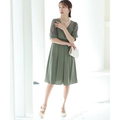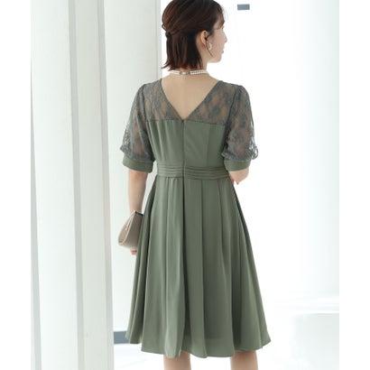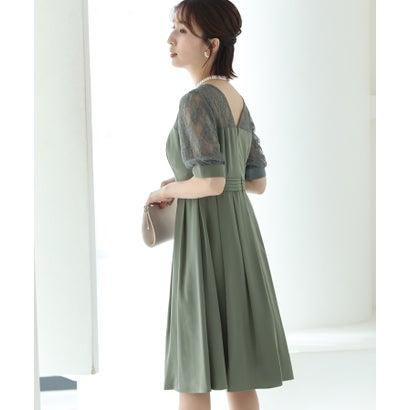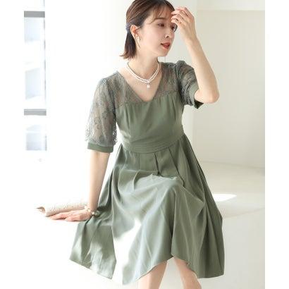 PourVous プールヴー ミニ丈&七分袖フォーマルレース切り替えお呼ばれ結婚式パーティードレス ワンピース 20代 30代 40代 (モスグリーン