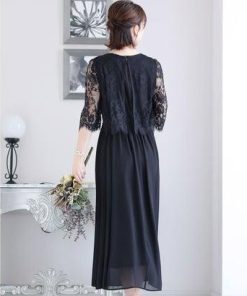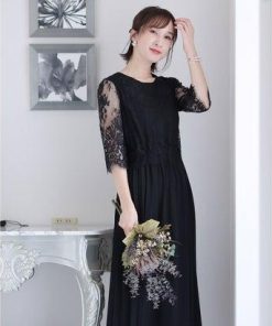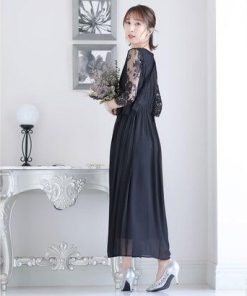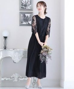 PourVous プールヴー ミモレ丈&七分袖フォーマルサイドプリーツ大きいサイズ結婚式パーティードレス ワンピース 20代 30代 40代 (ブラッ