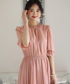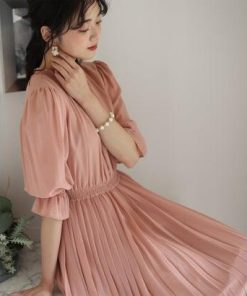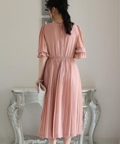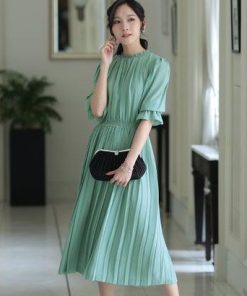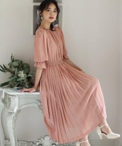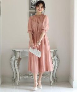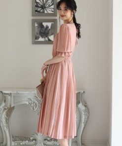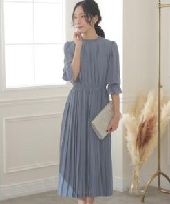 PourVous プールヴー ミモレ丈&袖ありフォーマルシフォンプリーツセレモニー結婚式パーティードレス ワンピース 20代 30代 40代 (ダステ