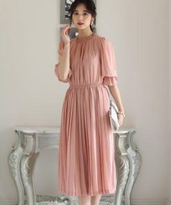 PourVous プールヴー ミモレ丈&袖ありフォーマルシフォンプリーツセレモニー結婚式パーティードレス ワンピース 20代 30代 40代 (ダステ
