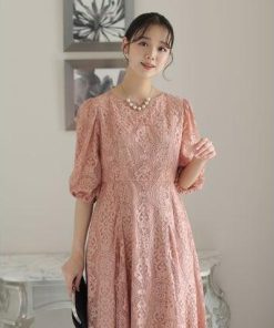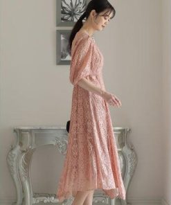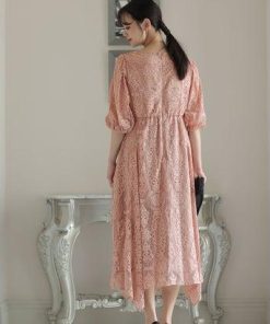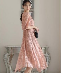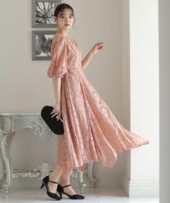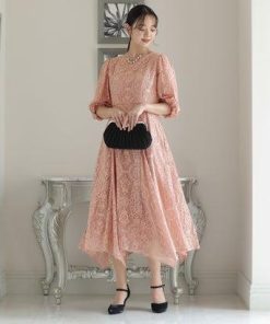 PourVous プールヴー 刺繍リボン付きパーティードレスセレモニーロング&七分袖結婚式フォーマル ワンピース 20代 30代 40代 (ピンク)