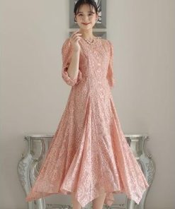 PourVous プールヴー 刺繍リボン付きパーティードレスセレモニーロング&七分袖結婚式フォーマル ワンピース 20代 30代 40代 (ピンク)