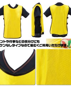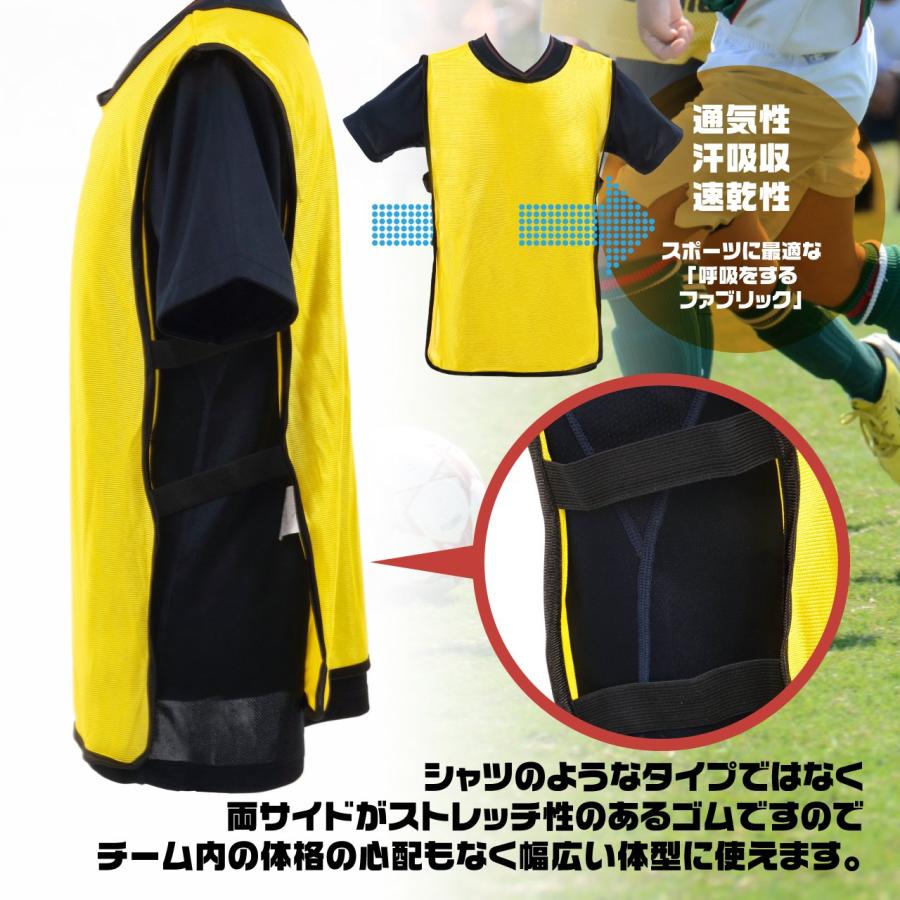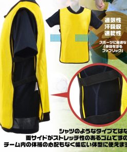 サイズ:フリーサイズ シャツのようなタイプではなく、両サイドがストレッチ性のあるゴムですので、チーム内の体格の心配もなく幅広い体型に使えます。お年を召した方は結構肩が上がらないのでTシャツタイプのビブスは脱ぎにくいといった不便な点がありますが、サイドゴムタイプはそういうこともありません。