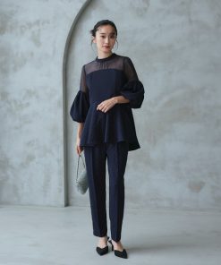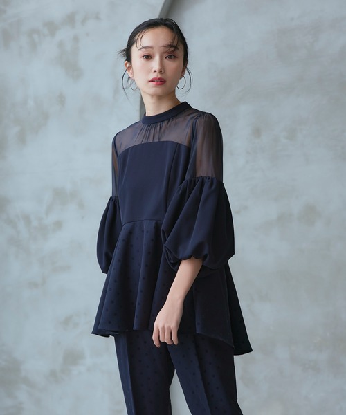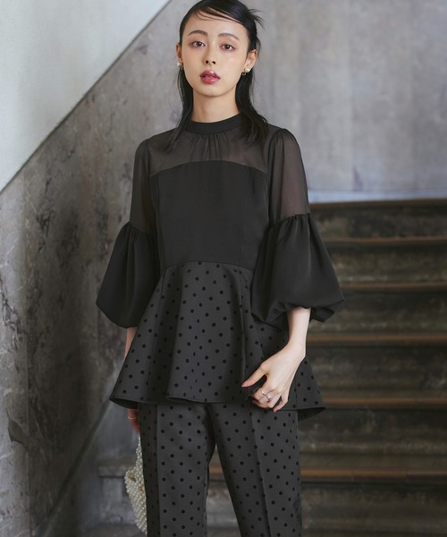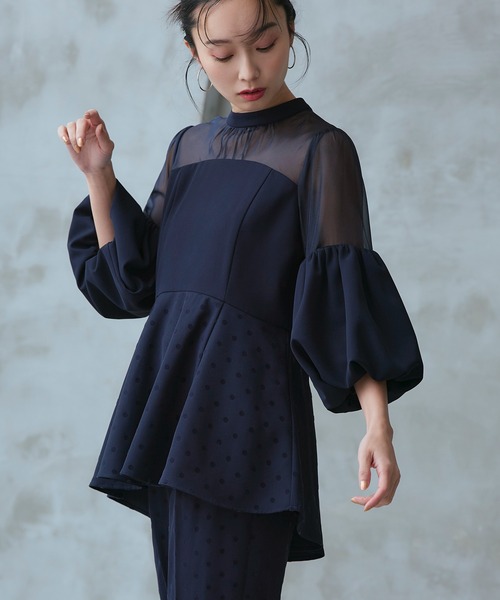 素材:[ ブラック×ドット] 【トップス】本体: ポリエステル100%, オーガンジー: ポリエステル100%, ドット: ポリエステル79%, レーヨン18%, ポリウレタン3%, 裏地: ポリエステル100%, 【パンツ】表地: ポリエステル79%, レーヨン18%, ポリウレタン3%, 裏地: ポリエステル100%, [ ネイビー系] 【トップス】本体: ポリエステル100%, オーガンジー: ポリエステル100%, ドット: ポリエステル100%, 裏地: ポリエステル100%, 【パンツ】表地: ポリエステル100%, 裏地: ポリエステル100%, [ 他の色] 【トップス】表地: ポリエステル100%, 別地: ポリエステル100%, 裏地: ポリエステル100%, 【パンツ】表地: ポリエステル100%, 裏地: ポリエステル100%