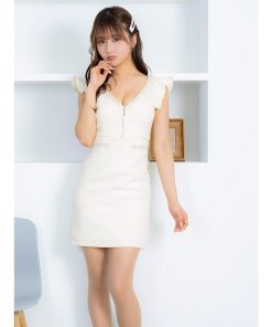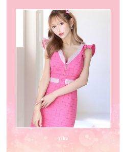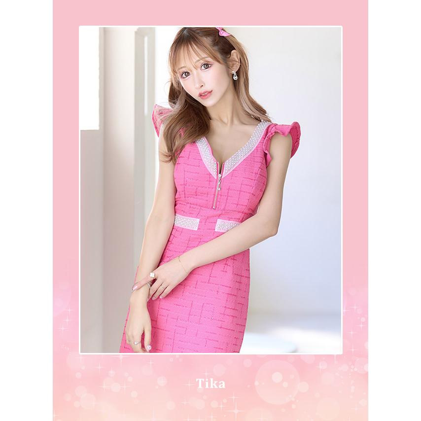 Tika キャバドレス ノースリーブ フリル袖 Vネック パールビジュー バストジップ ツイード タイト ミニドレス
