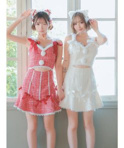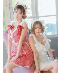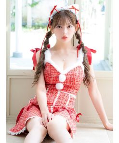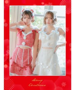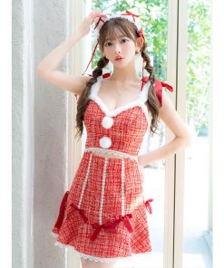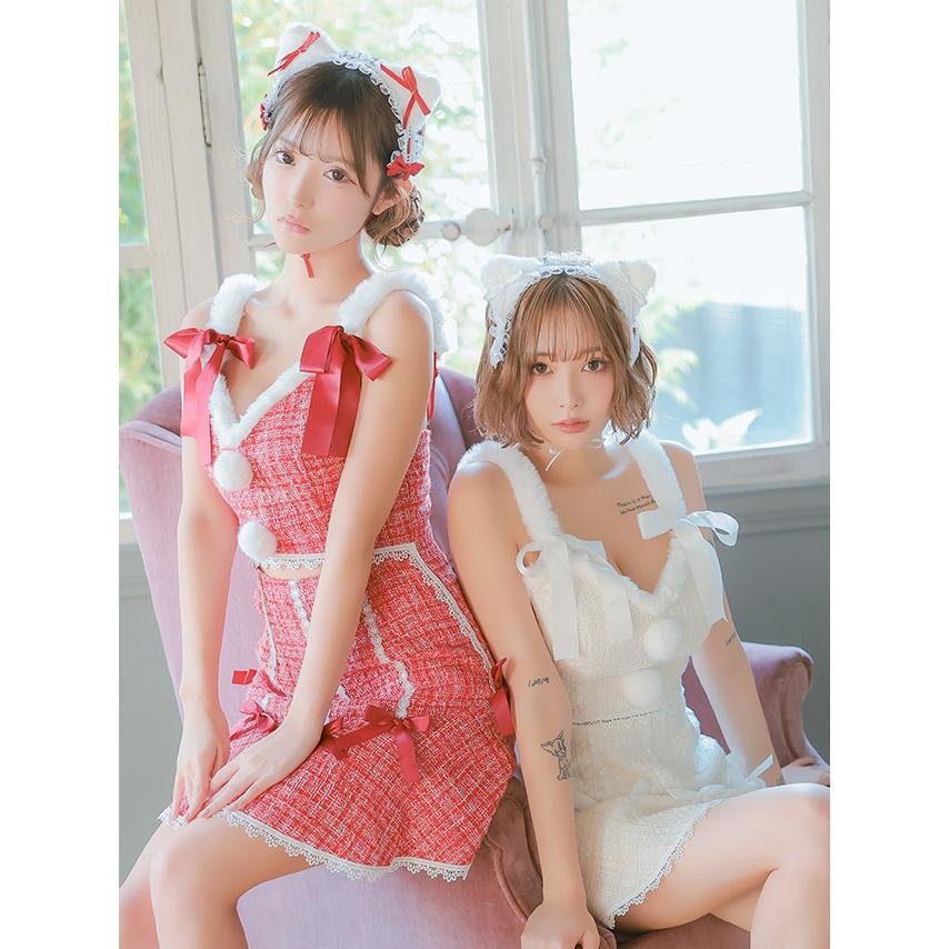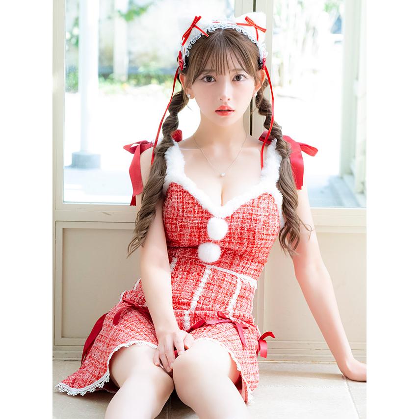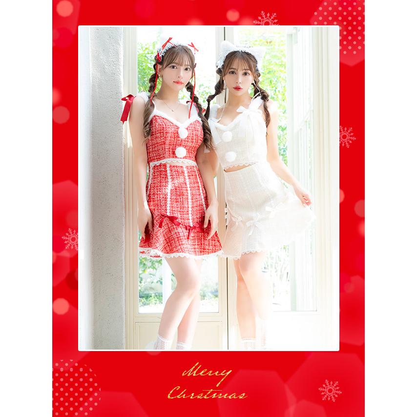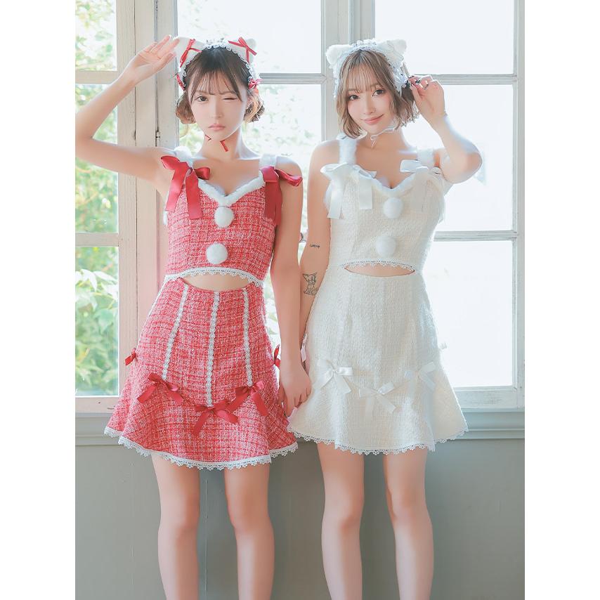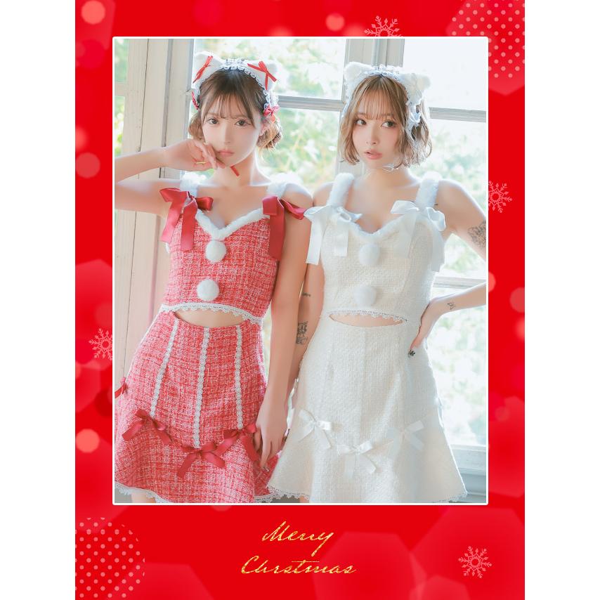 Tika サンタ コスプレ サンタコス 2点set ツイード リボン ウエストカット フレアスカート ガーリー ペア猫 アニマルサンタ コスプレドレス