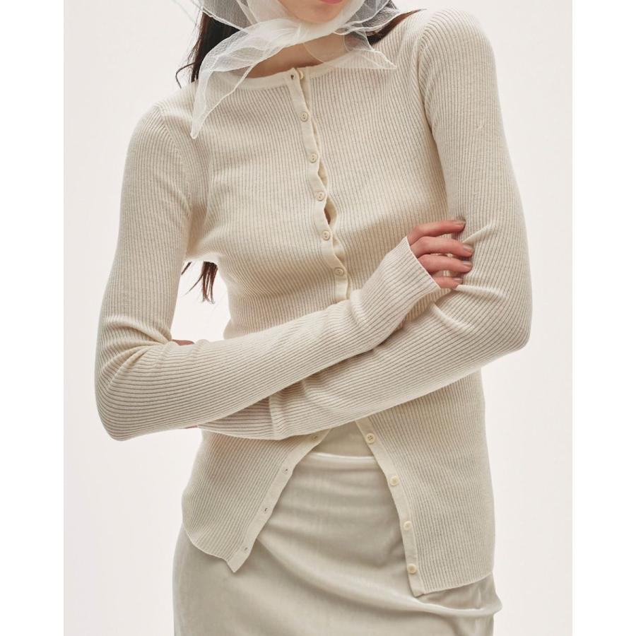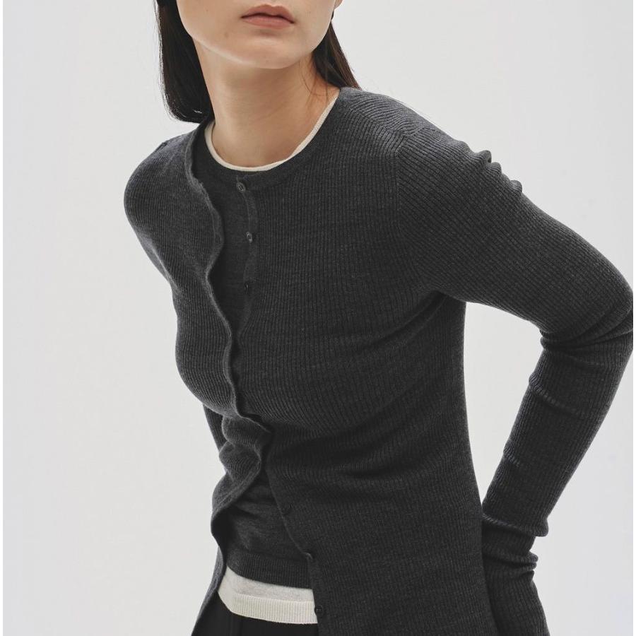 シルクウールの糸を使用して編まれたカーディガン。縫い目がなく一枚の編み地で作られたデザインが魅力で、やわらかく温かみのある質感が体に心地良くフィットします。ミニマルなデザインは洗練された印象を与え、ボトムスのシルエットを選ばず様々なスタイリングに馴染みます。