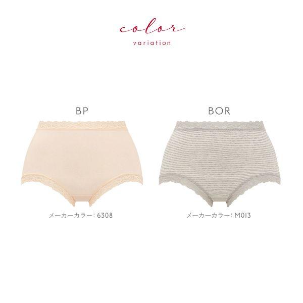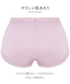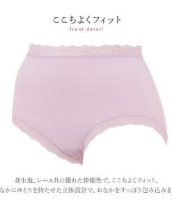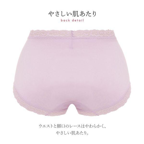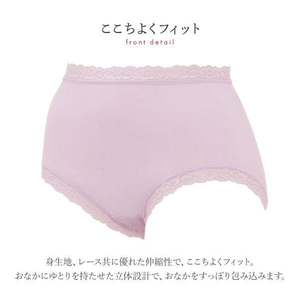 おなかにゆとりを持たせた立体設計で、おなかをすっぽり包み込みます。ウエストと脚口のレースはやわらかく、やさしい肌あたり。